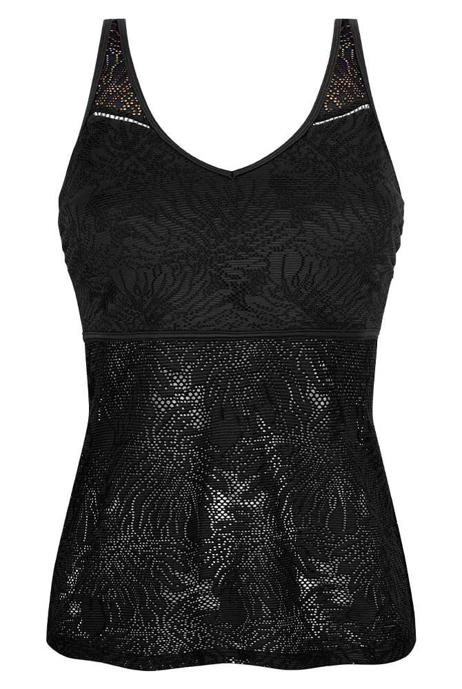Mit edlem Schwarz in zarter Spitzenoptik überzeugt der zauberhafte Prothesen Tankini Palma von Amoena mit raffiniertem Jacquard-Material im Blätterdesign mit halbtransparenten unterlegten Bereichen. Der attraktive Stil verleiht Ihnen einen Hauch Extravaganz. Der vorteilhafte V-Ausschnitt zaubert ein entzückendes Dekolleté. Das hochwertige Material zeichnet sich durch hohe Beständigkeit gegenüber Chlor und anderen Materialien aus. Es bietet ausgezeichnetem UV-Schutz 50+ und damit einen optimalen Schutz für empfindliche Haut. Die Träger verlaufen im Rücken schmal und sind verstellbar. Sie optimieren den Halt und perfektionieren die Passform des wunderschönen Prothesen Tankinis Palma. Ein stützendes Innenbustier mit beidseitig eingearbeiteten Prothesentaschen und weich gepolsterten Cups ohne Bügel hält Ihre Brustprothese sicher verwahrt.