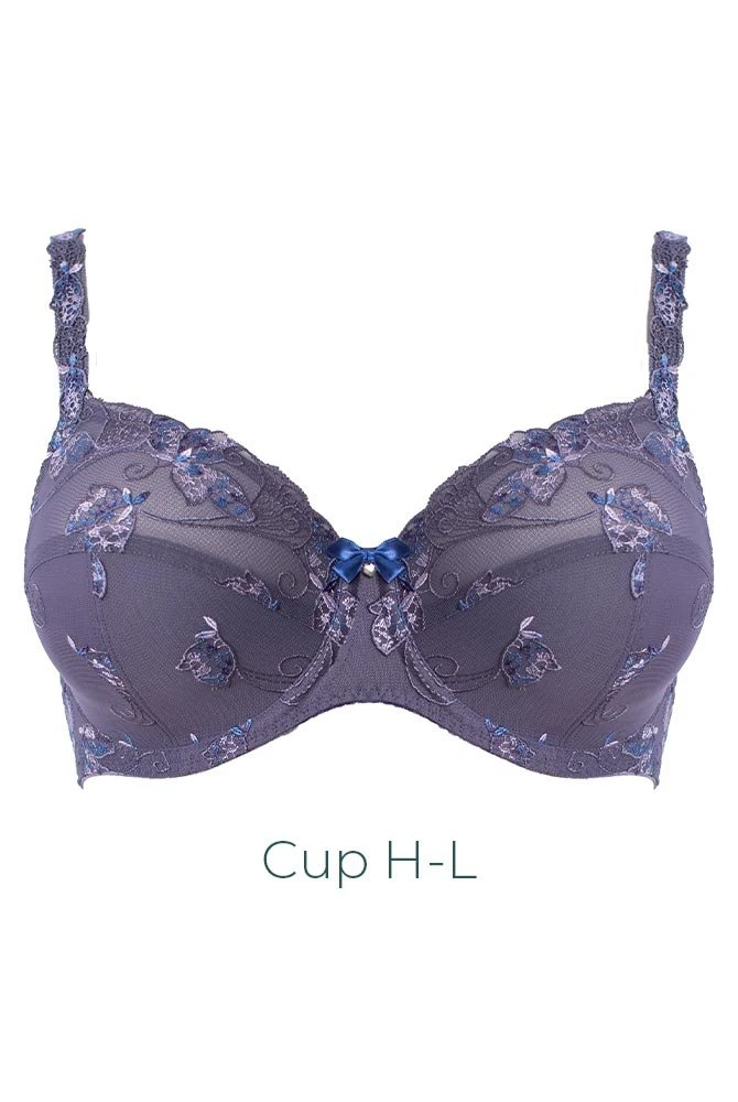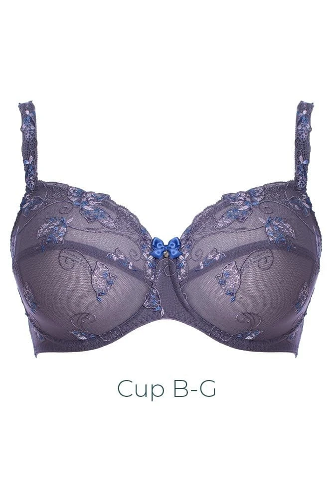 Elegant und außergewöhnlich wirkt Bügel-BH Carla mit verführerisch transparenten Cups, edel bestickt, mit feinster Schweizer Stickerei. Zarte Blüten auf weichem, transparent schimmerndem Tüll sind ein Highlight und geben dem BH-Modell eine besonders feminine Ausstrahlung. Die Cups sind mit stützendem Bügel und einer sanft formgebenden Quernaht verarbeitet.
