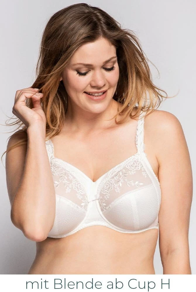 BH Ella mit Bügel sorgt bei einer großen Cupgröße dank raffinierter Schnittführung und dreigeteiltem Cup mit stützender Seitenblende für einen perfekten Sitz. Der Vollschalen-BH umschließt die Brust ganz, formt den Busen wunderschön rund und garantiert Ihnen eine feminine Silhouette und hohen Tragekomfort. Das Obercup bei BH Ella wird zu einem attraktiven Blickfang durch die feine Schnürlistickerei mit romantisch anmutenden Blüten und Blättern. Durch die zarte Stickerei erhält der Lingerie-BH eine romantische Note. Der Mittelsteg ist bei Ella durch ein zartes Schleifchen liebevoll geschmückt.