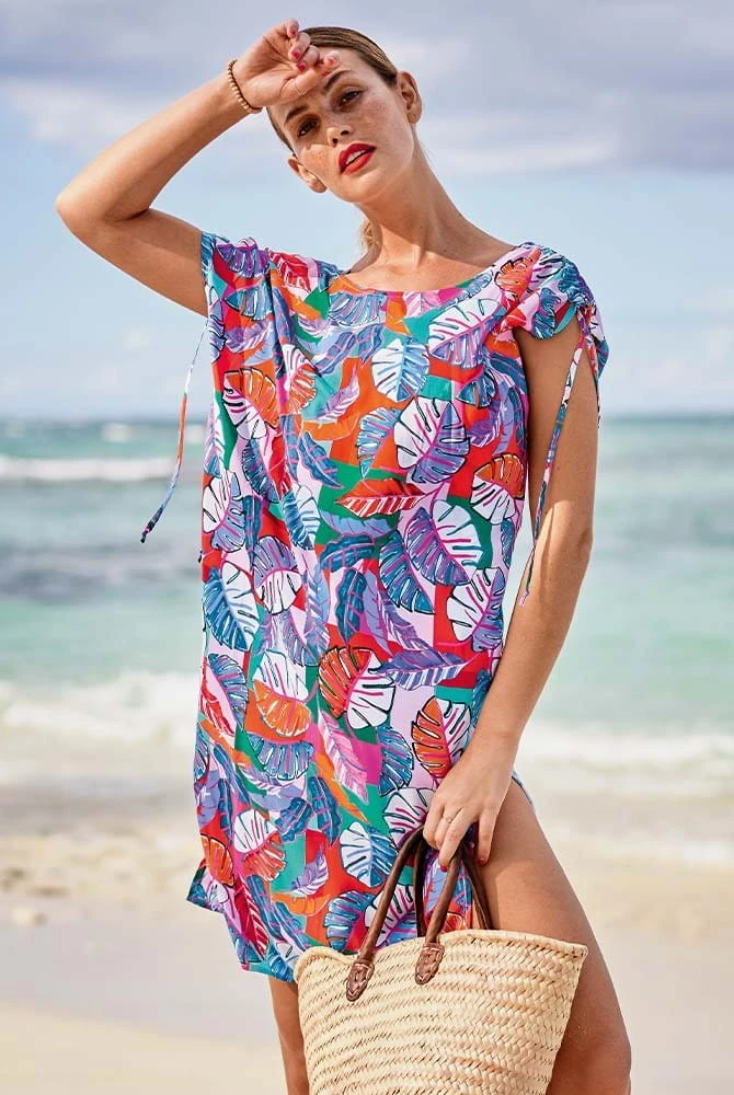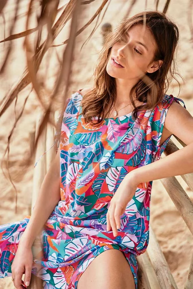 Mit einer gelungenen Farbkombination sticht unser Strandkleid Marajo sofort positiv ins Auge! Das aufregende Tropik-Design ist sowohl am Strand als auch in der City ein echter Eye-Catcher. Die seitlichen Schlitze bieten viel Bewegungsfreiheit und mit den Raffungen an den Schultern lässt sich das tropische Topic-Beachaccessoire zu verschiedenen Styles ergänzen. Praktische Eingriffstaschen an den Seiten bieten viel Platz für kleine Urlaubsouvenirs.